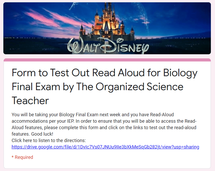 A number of my students receive reading aloud of test questions and/or passages and/or answer choices as an accommodation per their Individualized Education Plan (IEP). In order to still provide them with this accommodation via distance or digital learning, I have decided to use Google Forms for this final exam.