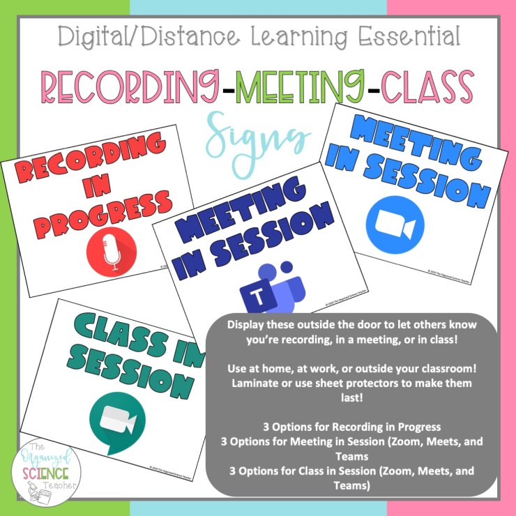 Door signs for recording in progress, meeting in session, and class in session. There are Google Meet, Microsoft Teams, and Zoom versions for both meetings and class and three different options for the recording in progress sign!